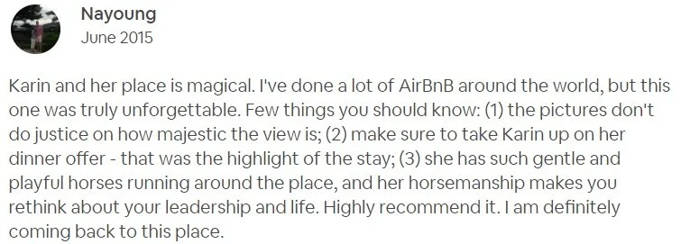 What a lovely experience!!! Karin is a warm and generous host Spectacular views from an incredible room in Karin’s stunning house. We felt welcome immediately and spent some wonderful time in conversation with Karin.